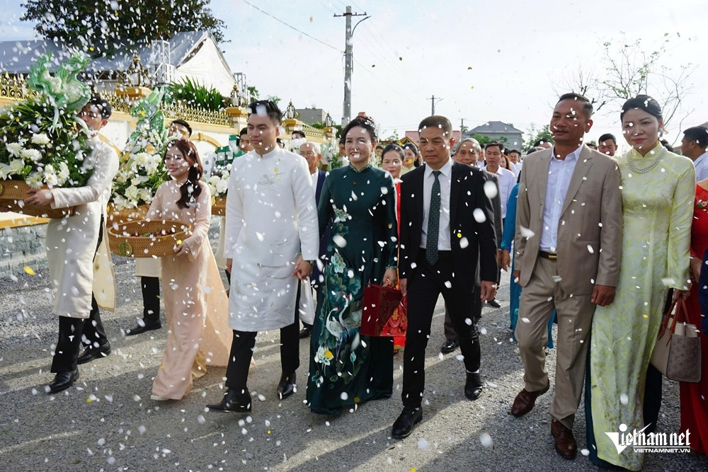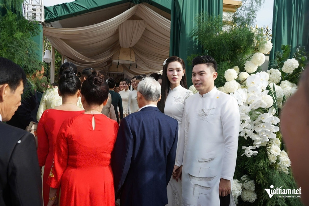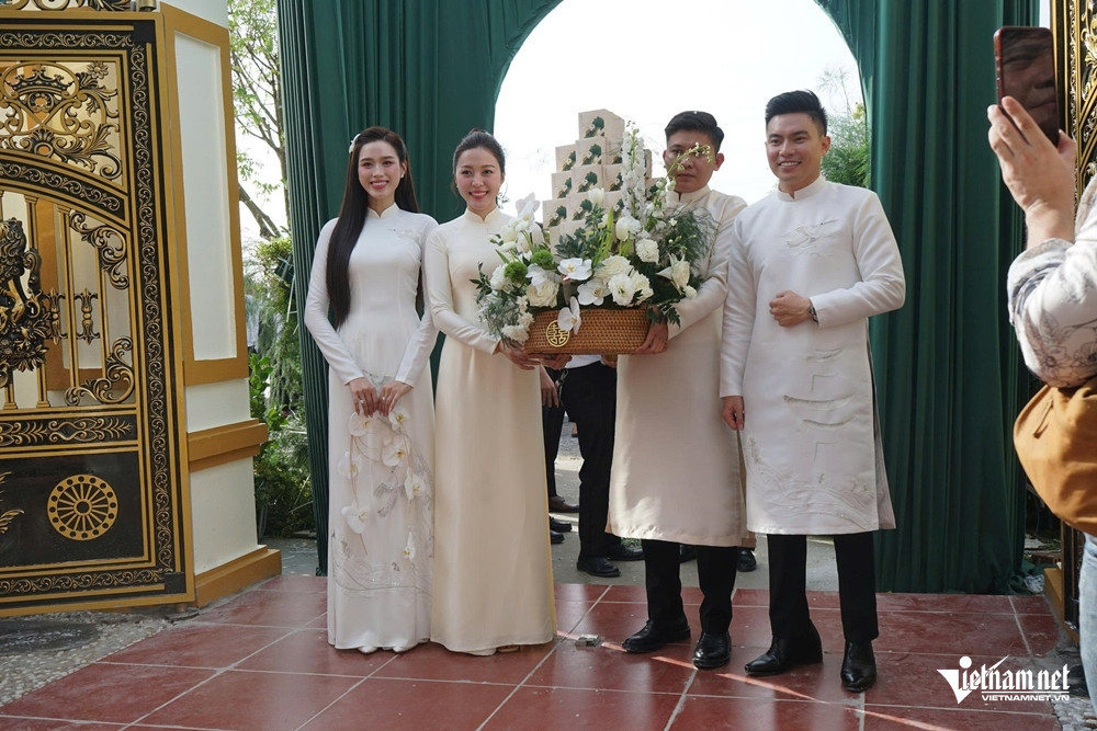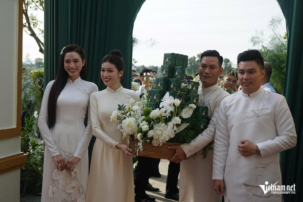 Đỗ Thị Hà và doanh nhân Nguyễn Viết Vương diện áo dài trắng bên đội ngũ bê tráp. Ảnh: Lê Dương
