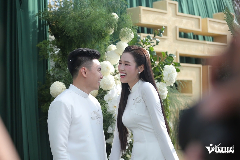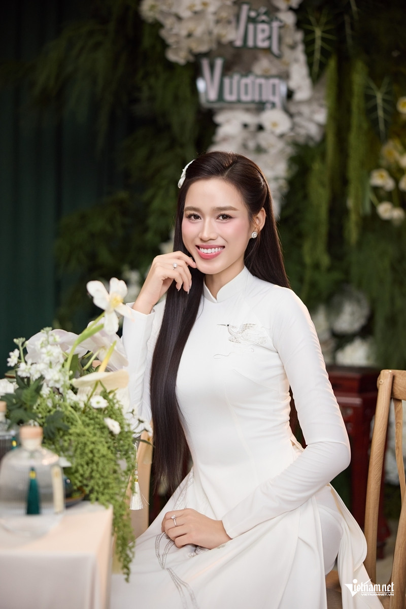 Tại đám hỏi, Đỗ Thị Hà xuất hiện trong bộ áo dài trắng đơn giản nhưng tinh tế, gương mặt rạng ngời hạnh phúc.