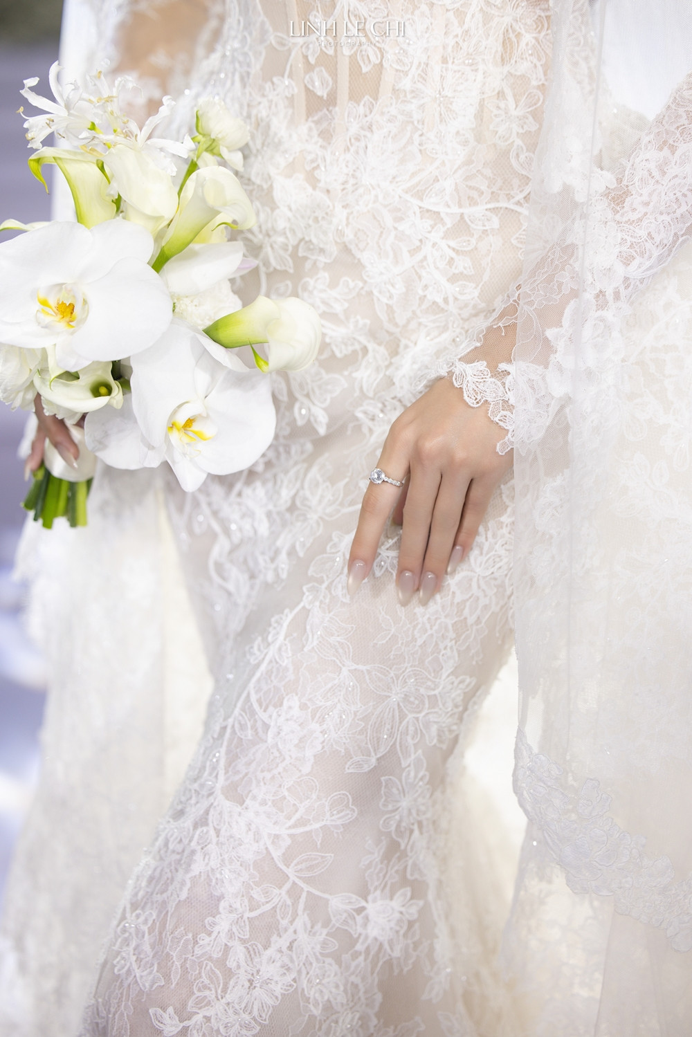 Đỗ Thị Hà gây ấn tượng với bộ váy cưới ren xuyên thấu tinh tế ôm sát cơ thể. Nàng hậu để tóc đính kèm khăn voan dài chấm xuống sàn, tạo vẻ đẹp cổ điển nhưng không kém phần hiện đại. Cô dâu cũng gây chú ý khi 'dát kim cương' đắt tiền lên người gồm vòng cổ, hoa tai và nhẫn cưới.