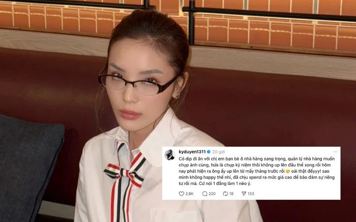 Theo đó, cô và bạn bè đi ăn ở một nhà hàng sang trọng. Khi quản lý nhà hàng ngỏ ý xin phép chụp ảnh lưu niệm, Kỳ Duyên đã yêu cầu không "public" bức hình. Tuy nhiên, sau đó, nàng hậu đã phát hiện hình ảnh đã bị đăng tải công khai từ nhiều tháng trước.