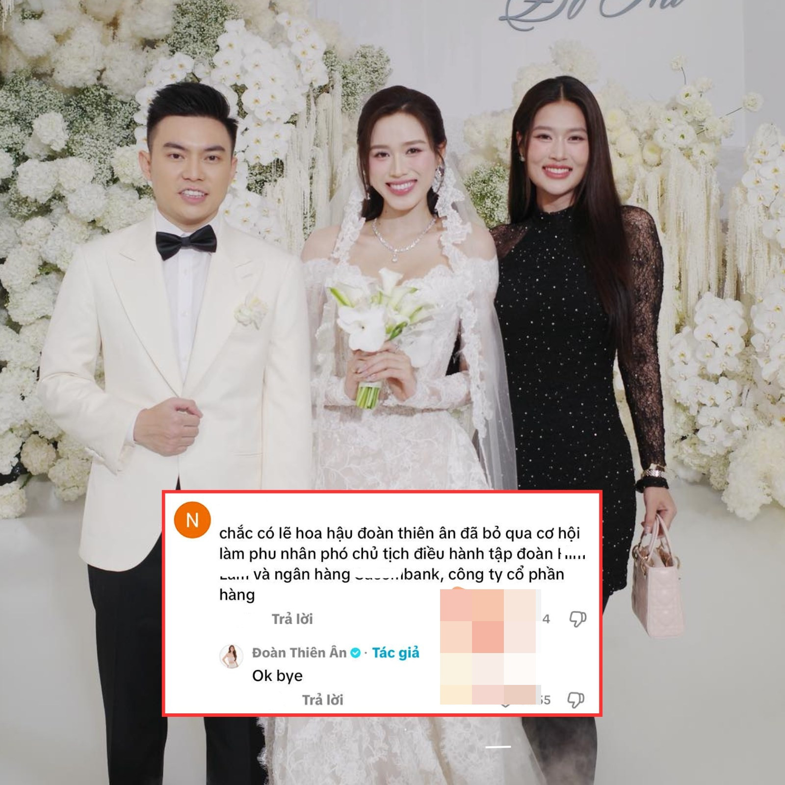 Xuất hiện trong đám cưới, Thiên Ân khoe vẻ ngoài rạng rỡ trong chiếc đầm màu đen chuẩn dresscode. Thế nhưng khi xả loạt ảnh dự đám cưới người em thân thiết, phía dưới bài đăng, một cư dân mạng để lại bình luận gây chú ý: "Chắc có lẽ Hoa hậu Đoàn Thiên Ân đã bỏ qua cơ hội làm phu nhân Phó Chủ tịch điều hành tập đoàn và ngân hàng".