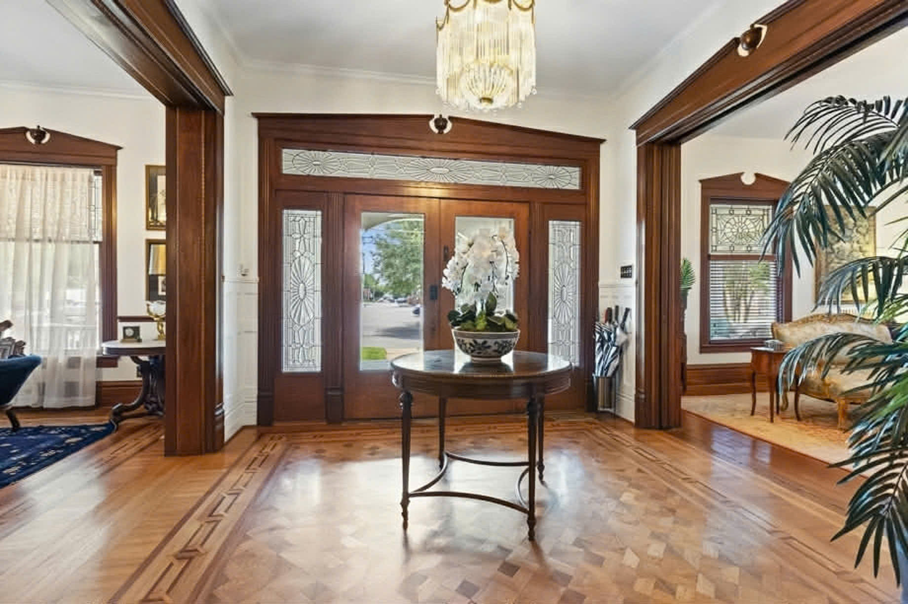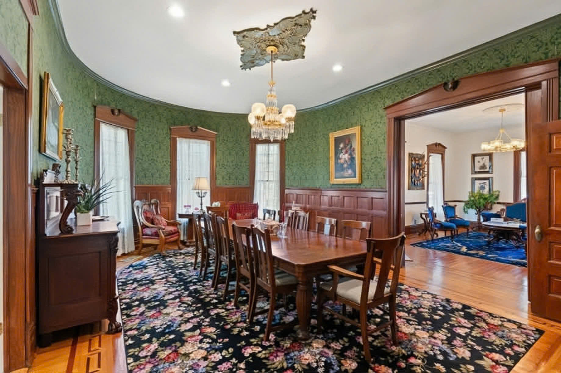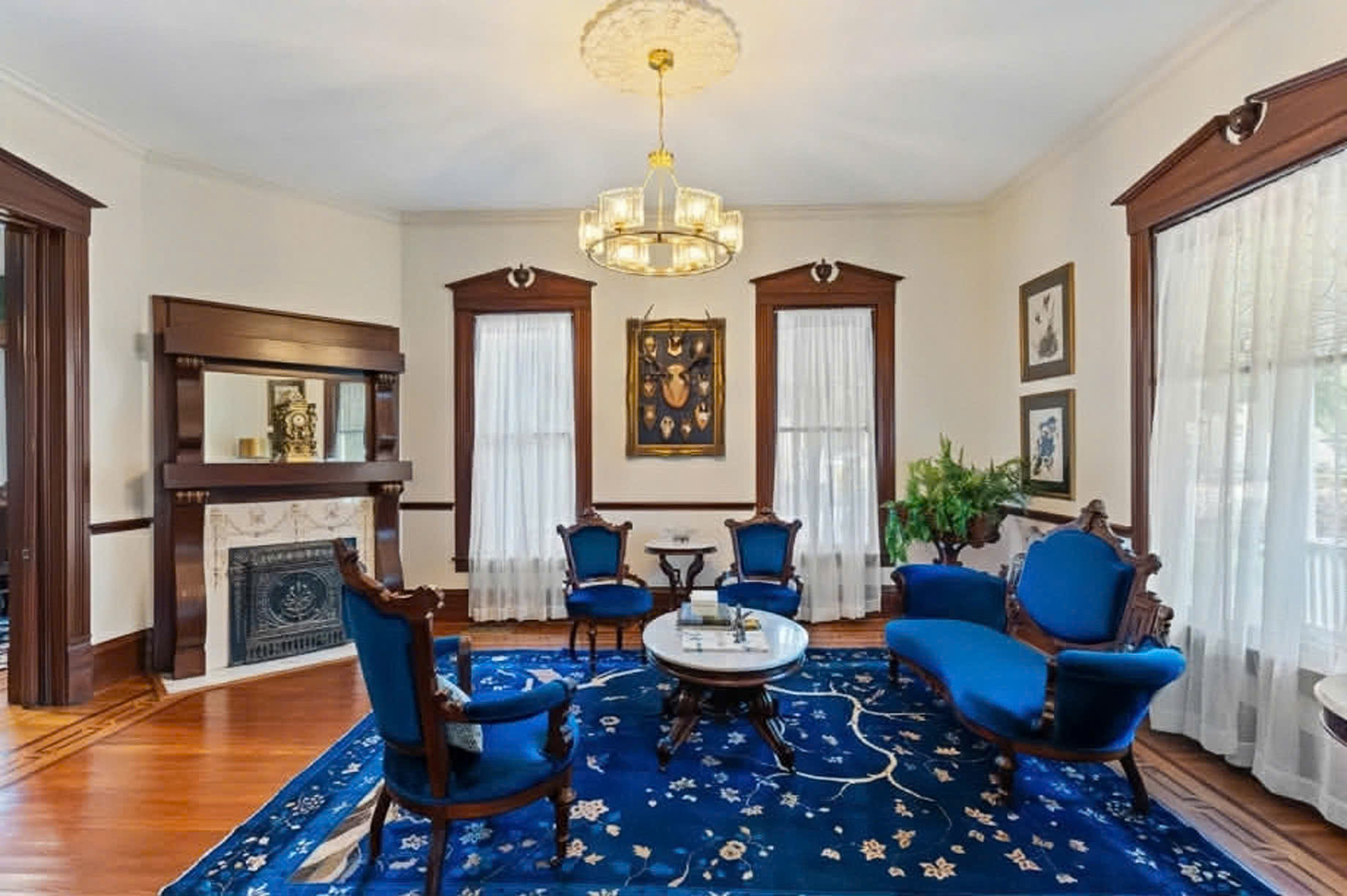 Ngôi nhà trải qua nhiều lần cải tạo, trùng tu nhưng vẫn giữ vẻ đẹp cổ điển. Phòng khách bên trong nổi bật với nhiều chi tiết gỗ màu nâu sẫm, hài hòa với sàn gỗ tự nhiên, tạo không gian sang trọng và ấm cúng.