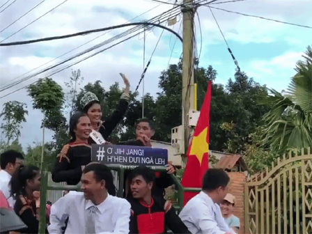 Chiều 22/1, H'Hen Niê được cha mẹ và buôn làng ra đón khi lần đầu tiên trở về quê nhà sau đăng quang Hoa hậu Hoàn vũ Việt Nam 2017. Tuy nhiên, trên đường chở tân Hoa hậu diễu hành, chiếc xe bỗng dừng đột ngột vì hết xăng. Do xe phanh quá gấp gáp, nên chiếc vương miện đội trên đầu H'hen Niê bỗng rơi xuống. H'Hen Niê đã đưa tay đỡ và giữ được chiếc vương miện. Tình huống thật đáng yêu và cũng chỉ có thể bắt gặp ở cô Hoa hậu về làng bằng xe công nông này.