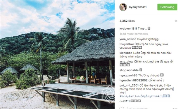 Kể từ scandal hút thuốc lá trong quán cà phê, Hoa hậu Kỳ Duyên "bặt vô âm tím". Cô không tham dự các sự kiện cũng như không chia sẻ hay đăng tải bất cứ hình ảnh nào trên các trang mạng cá nhân. Tuy nhiên, mới đây, trên Instagram, Hoa hậu Việt Nam 2014 bất ngờ đăng tải hình ảnh hiếm. Có thể thấy, trong ảnh dường như cô đang đi nghỉ dưỡng ở một khu sinh thái, có đồi núi bao bọc.