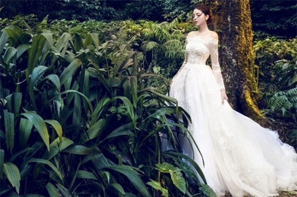 Các mẫu váy cưới ren lộng lẫy khi trễ vai, lúc lại khoét sâu vòng một giúp Hoa hậu khoe được nét gợi cảm của tuổi 19.
