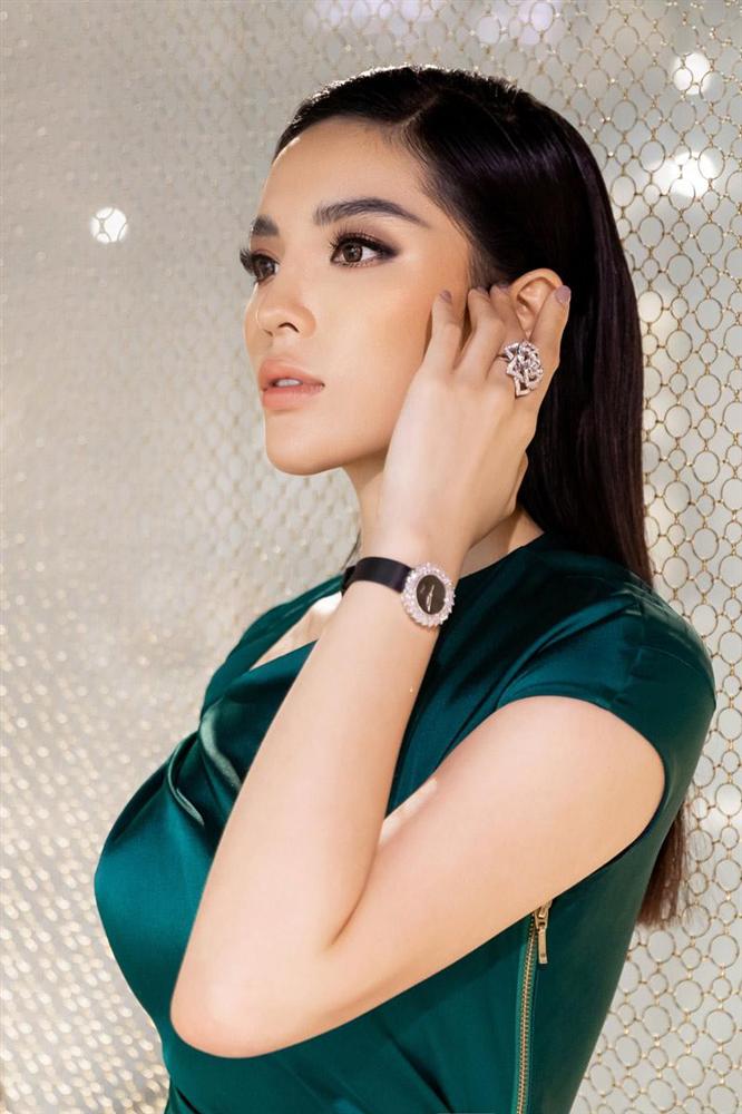 Kỳ Duyên gây chú ý với chiếc váy màu xanh ngọc lục bảo của NTK Lê Thanh Hoà để phối cùng bộ trang sức kim cương lấp lánh xa hoa gồm đồng hồ, nhẫn và hoa tai.