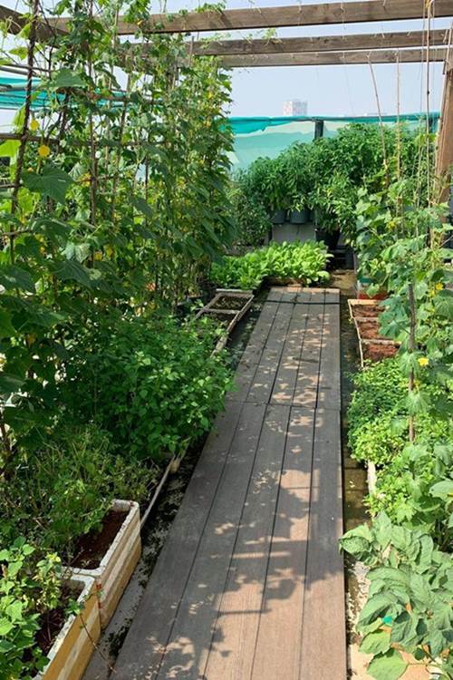 Vườn rau trên sân thượng của Phương Lê có: bầu, bí, mướp, dưa leo, đậu bắp, ớt, chanh, nhiều loại rau thơm...