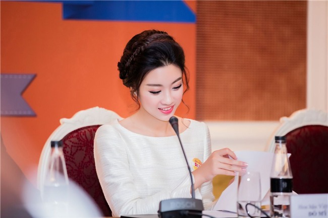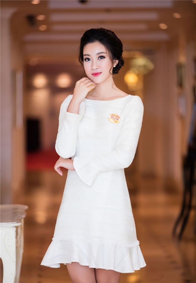 Hoa hậu Việt Nam 2016 thu hút mọi ánh nhìn, khi xuất hiện trong buổi họp báo Chạy vì trẻ em Hà Nội với trang phục đầm trắng, tóc vấn cao, trang điểm nhẹ nhàng.