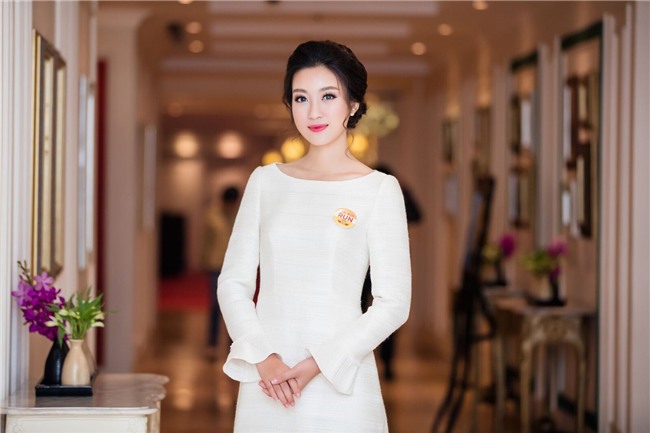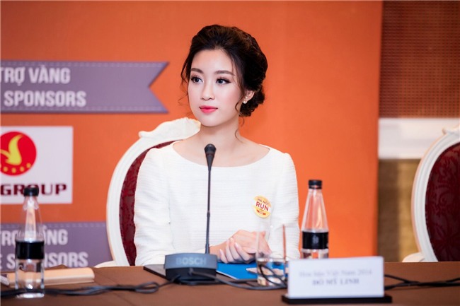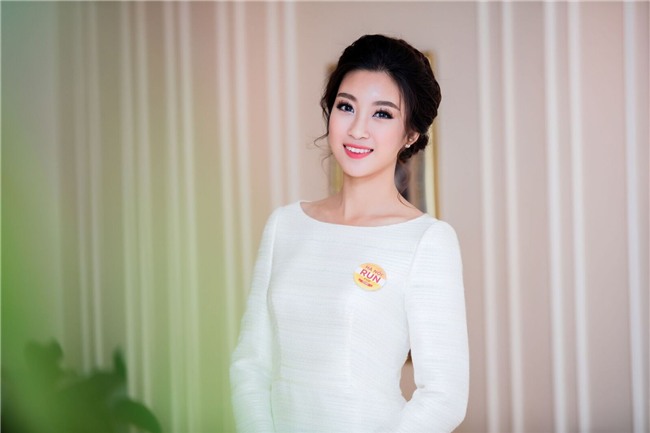 Hoa hậu Việt Nam 2016 xuất hiện trong buổi họp báo Chạy vì trẻ em Hà Nội với trang phục đầm trắng, tóc vấn cao, trang điểm nhẹ nhàng.