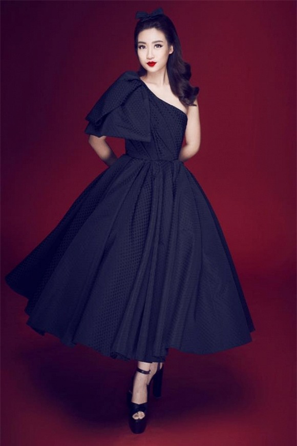 Mỹ Linh điệu đà, duyên dáng với thiết kế phom xòe kinh điển, được tạo điểm nhấn bằng phần vai lệch, chi tiết nơ to bản. Những đường gấp nếp góp phần làm tăng độ xòe bồng bềnh cho thiết kế.