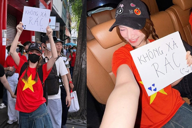 Ca sĩ Hòa Minzy mặc áo cờ đỏ sao vàng, cầm biển "không xả rác" kêu gọi mọi người ý thức giữ gìn vệ sinh trong những ngày chuẩn bị Đại lễ 30/4. Với hành động ý nghĩa này, Hòa Minzy được đặt biệt danh "khối trưởng khối nhặt rác".