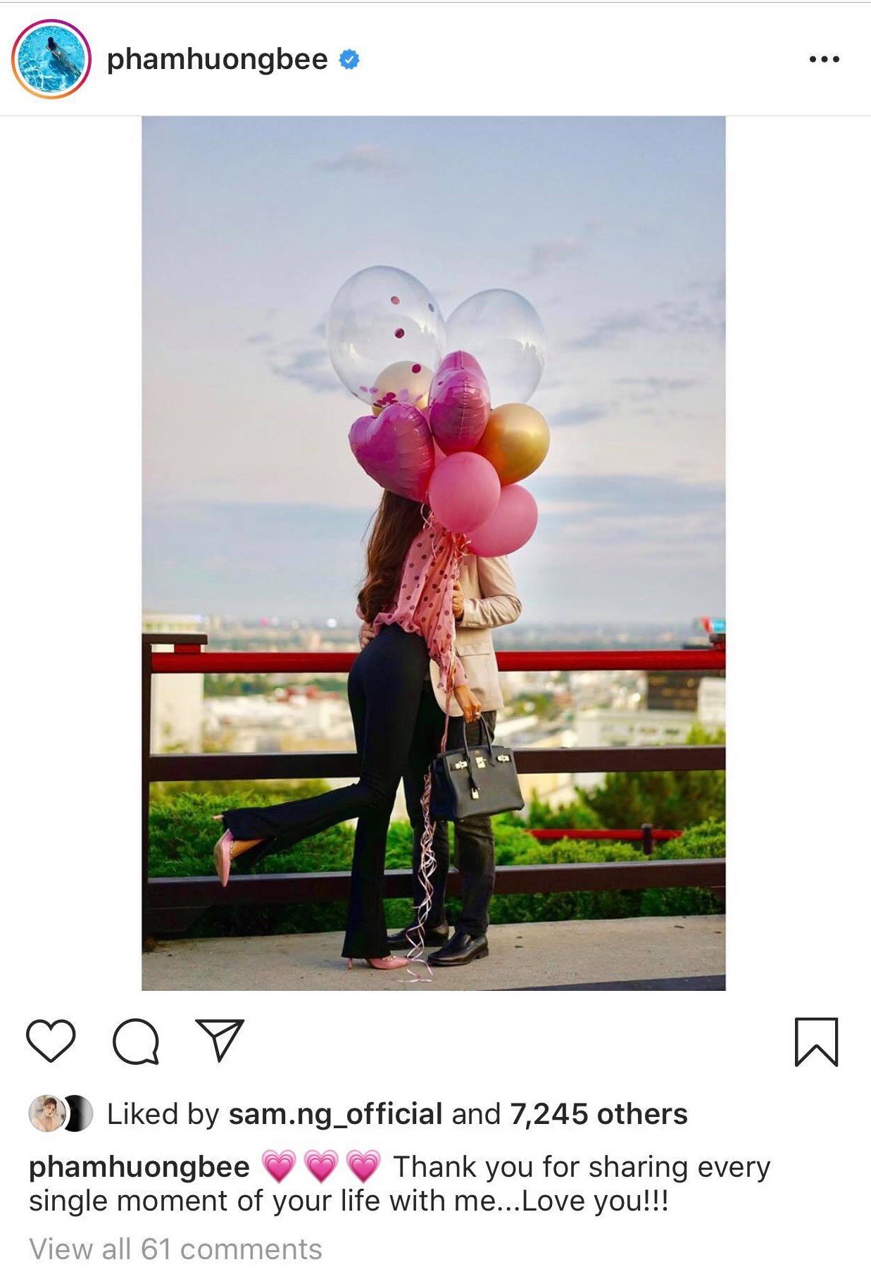 Phạm Hương chia sẻ: "Thank you for sharing every single moment of your life with me...Love you!!!" (tạm dịch: Cảm ơn vì đã chia sẻ từng khoảnh khắc trong cuộc đời anh với em... Yêu anh!!!).