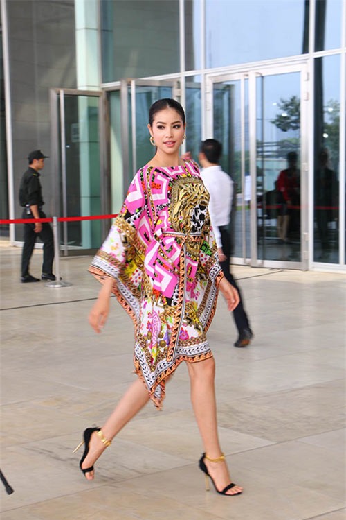 Khi vừa xuất hiện, Hoa hậu Hoàn Vũ Việt Nam 2015 Phạm Hương trở thành tâm điểm của sự kiện và thu hút ống kính phóng viên khi diện bộ đầm tông màu hồng với những họa tiết đặc trưng của Versace.