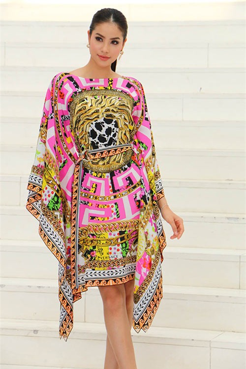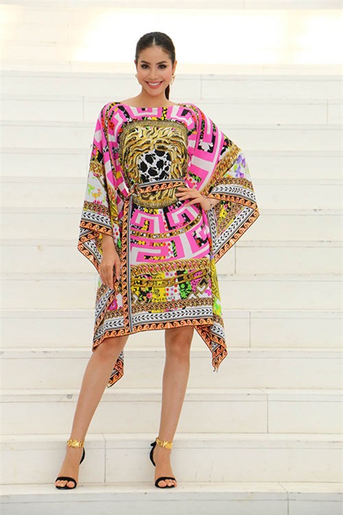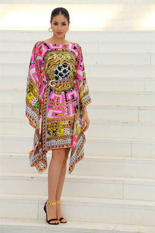 Hoa hậu Hoàn vũ Phạm Hương diện cả set đồ của thương hiệu Versace khi xuất hiện tại sự kiện tại Hà Nội sáng 6/5.