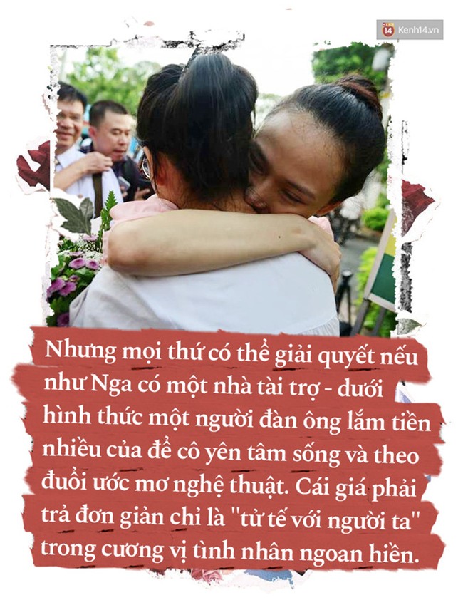 Nhưng mọi thứ có thể giải quyết nếu như Nga có một nhà tài trợ - dưới hình thức một người đàn ông lắm tiền nhiều của để cô yên tâm sống và theo đuổi ước mơ nghệ thuật. Cái giá phải trả đơn giản chỉ là "tử tế với người ta" trong cương vị tình nhân ngoan hiền. Và tất nhiên, Nga dù thông minh tuyệt đỉnh cũng chỉ là một người phụ nữ, một người đàn bà khát khao được che chở.