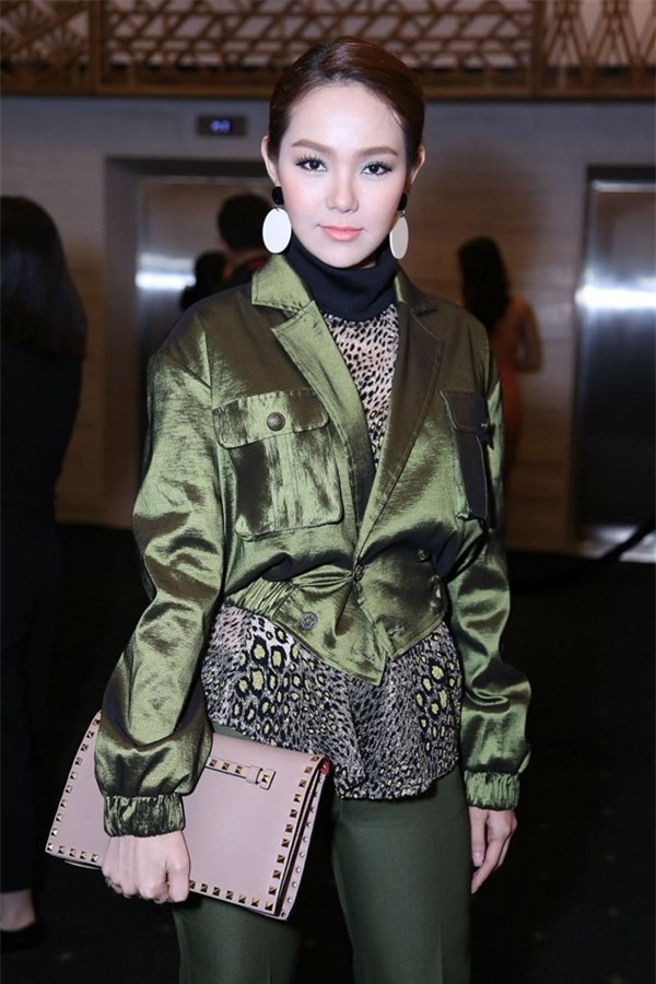 Người đẹp trang điểm đậm, làm tóc cá tính và cầm theo clutch da trăn.