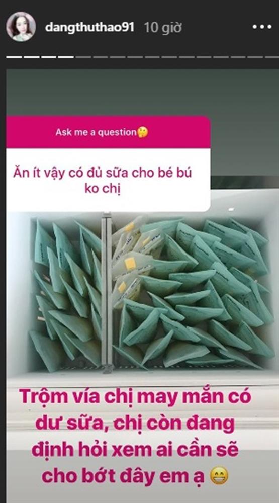 Kể từ khi hạ sinh bé Sophie vào tháng 3/2018, Hoa hậu Thu Thảo ít xuất hiện trước công chúng. Song trong số những lần hiếm hoi xuất hiện ấy, người hâm mộ thực sự ngỡ ngàng trước nhan sắc và cách lấy lại vóc dáng "thần tốc" sau khi sinh của người đẹp Bạc Liêu. Và cũng vì thế, không ít người đặt câu hỏi liệu việc giảm cân nhanh như thế có ảnh hưởng đến việc nuôi con bằng sữa mẹ của Hoa hậu hay không? Đáp trả lại thắc mắc này, Hoa hậu Đặng Thu Thảo đã không ngần ngại khoe cả tủ sữa trữ đông đầy ăm ắm kèm chú thích: "Trộm vía, chị may mắn có dư sữa. Chị còn đang hỏi xem ai cần sẽ cho bớt đây".