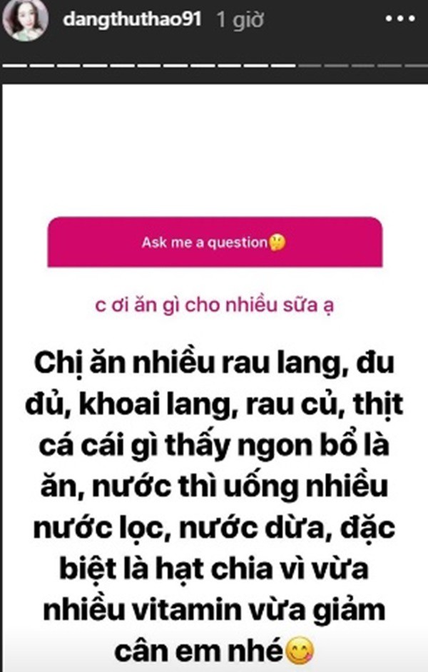 Tiết lộ thêm vì bí quyết để có cả tủ sữa trữ đông nuôi con, Hoa hậu Thu Thảo cho biết cô duy trì chế độ ăn uống lành mạnh, tập trung vào các món đủ dưỡng chất cho mẹ và bé. Cụ thể, Hoa hậu ăn nhiều rau lang, đu đủ, khoai lang, thịt cá... Kết hợp với chế độ ăn đó là uống thật nhiều nước lọc, nước dừa. Thêm vào đó, người đẹp cũng tích cực ăn hạt chia vừa giàu vitamin, vừa giúp mẹ giảm cân nhanh.