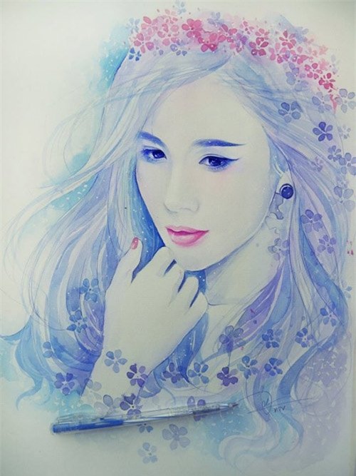 Thủy Tiên vẫn giữ được vẻ yểu điệu quyến rũ khi xuất hiện trong bức tranh được vẽ bằng bút bi