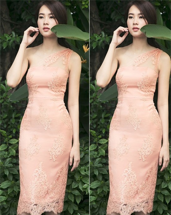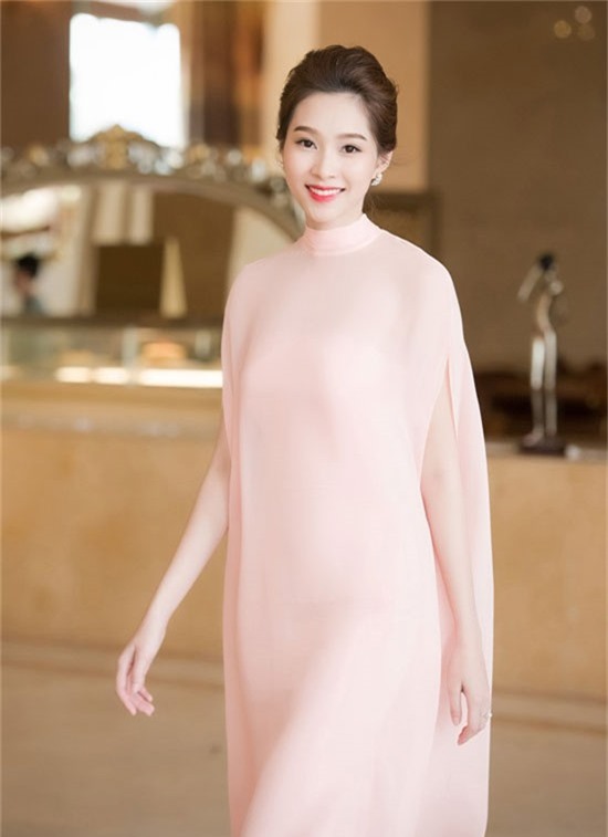 Cô toát lên vẻ kiêu sa, đài các với đầm hồng thạch anh, dáng xòe.
