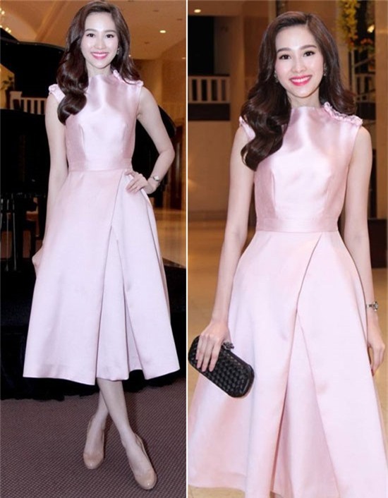 Váy hồng trang nhã được Thu Thảo mix cùng phụ kiện tối giản và tô son môi hồng tươi tắn.