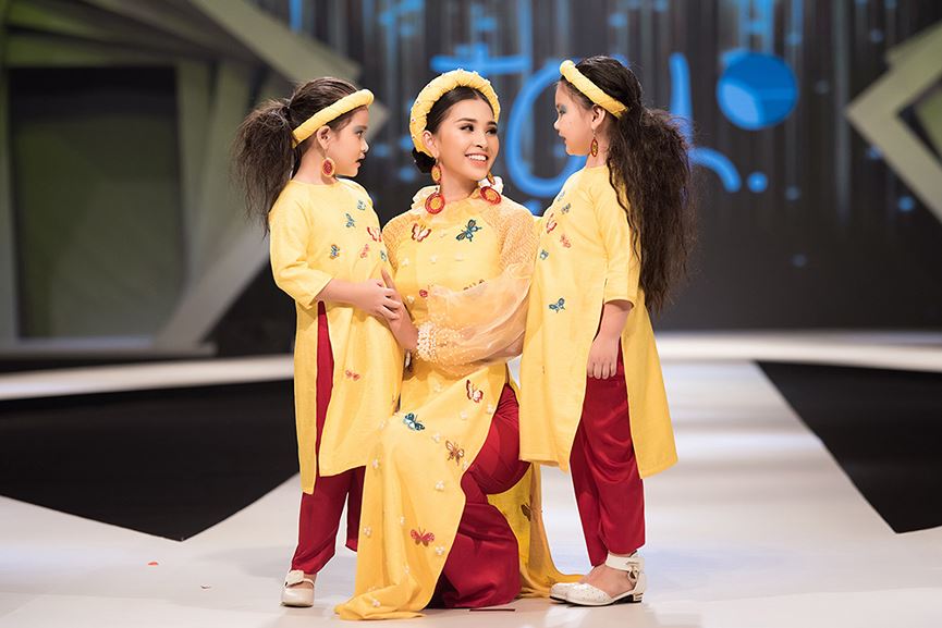 Trong sắc vàng và đỏ rực rỡ của trang phục, Tiểu Vy cùng dàn mẫu nhí như mang mùa xuân đến sớm cho cả sân khấu.
