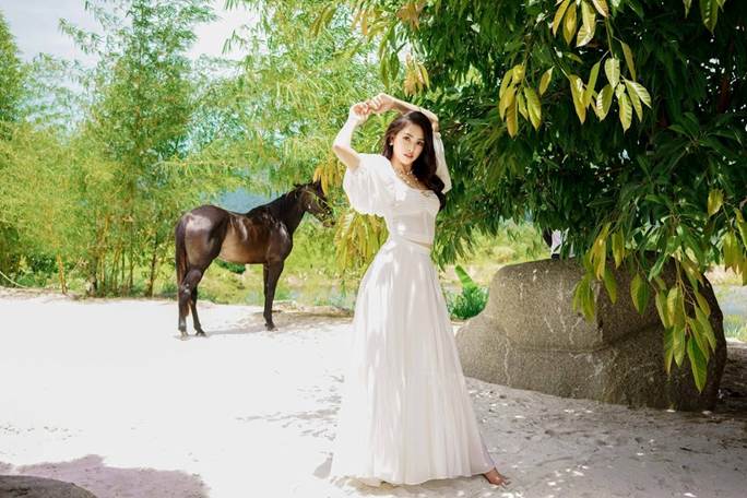 Trong bộ ảnh, Tiểu Vy như hóa nàng thơ với gương mặt xinh đẹp, vóc dáng gợi cảm, buông lơi vai trần trong bộ đầm maxi trắng tinh khôi.