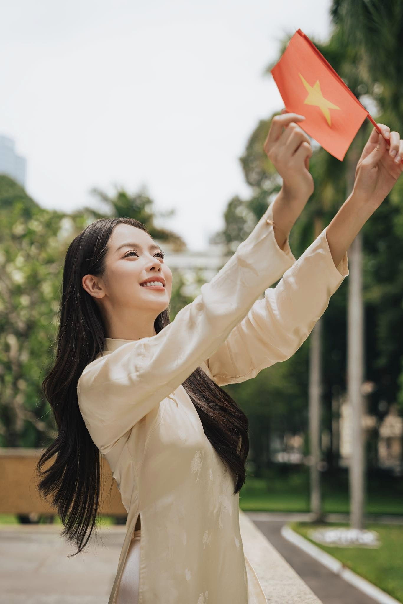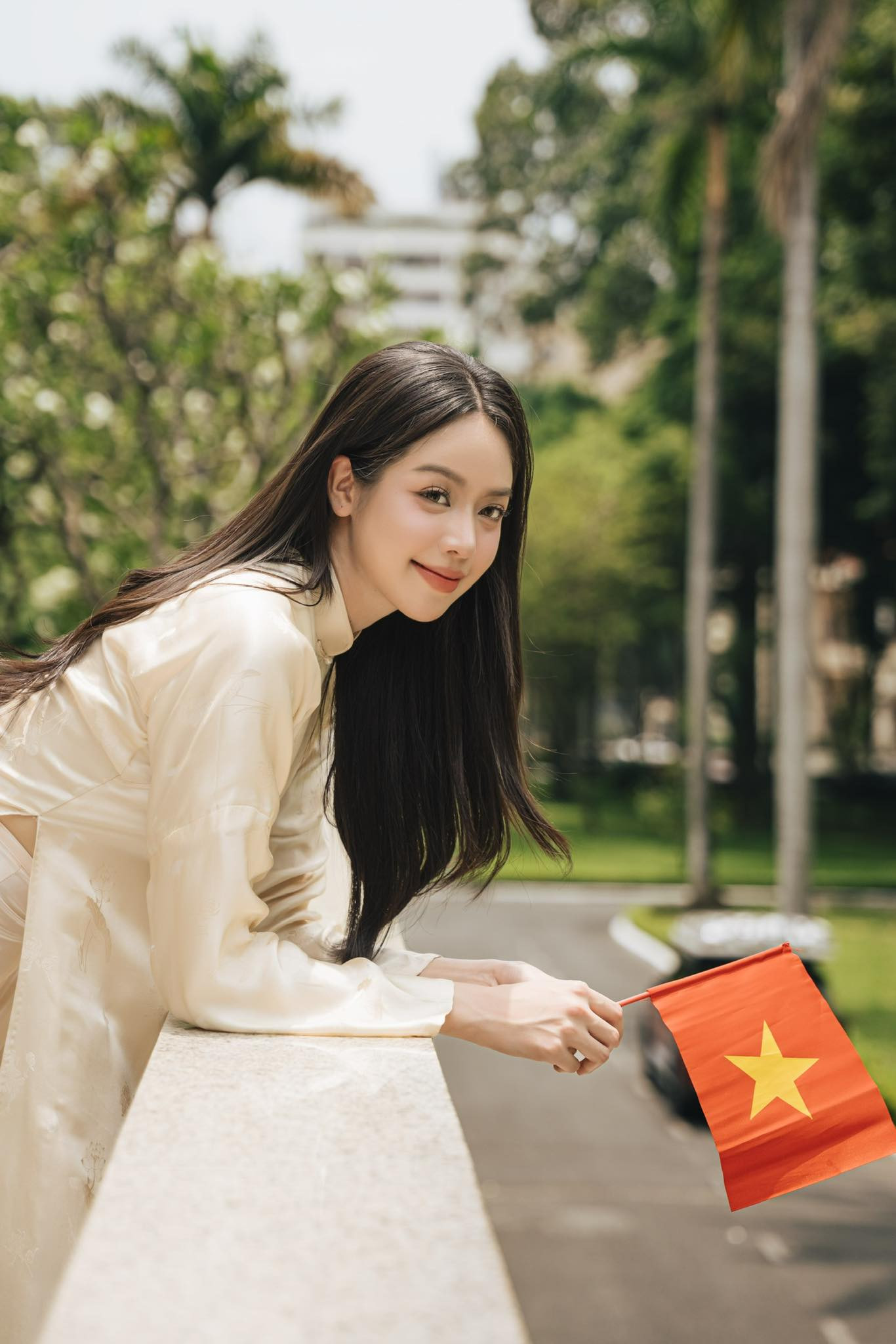 Hoa hậu Thanh Thủy mặc áo dài, để tóc xõa và trang điểm nhẹ nhàng, tôn lên nhan sắc trong trẻo và rạng rỡ.