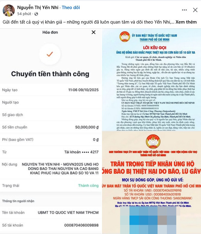 Kèm theo đó, người đẹp đăng hình ảnh chuyển khoản nóng 50 triệu đồng đến tài khoản UB MTTQ VN.