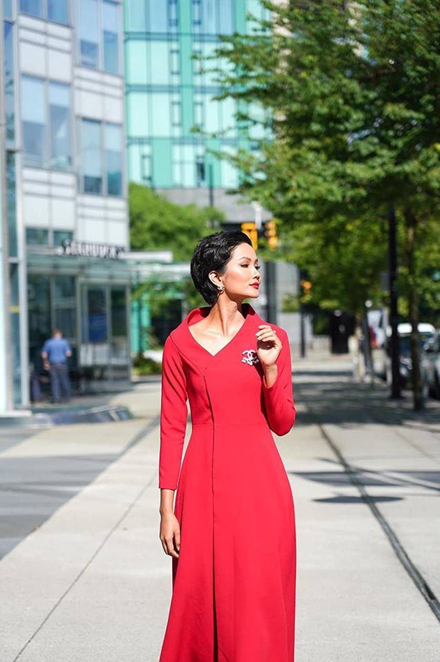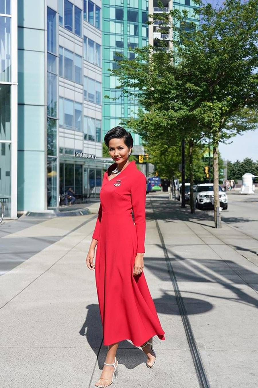 H'hen Niê khoe sắc với đầm đỏ rực rỡ dưới nắng vàng của Canada.