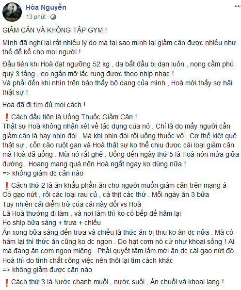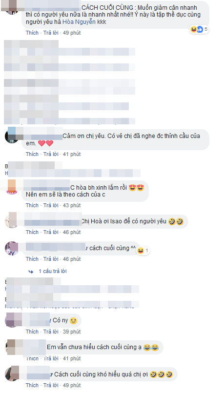Đáng chú ý, bí quyết giảm cân cuối cùng của Hòa Minzy nhận được rất nhiều ý kiến phản hồi. Nhiều người đặt câu hỏi ngược lại cho chủ nhân status: "Tại sao có người yêu lại giảm cân nhanh hả chị Hòa ơi?", "Làm sao để có người yêu hả chị?"...