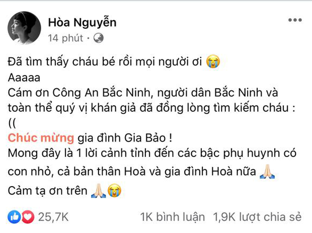 Nữ ca sĩ đăng tải trên trang cá nhân: "Đã tìm thấy cháu bé rồi mọi người ơi! Cám ơn Công An Bắc Ninh, người dân Bắc Ninh và toàn thể quý vị khán giả đã đồng lòng tìm kiếm cháu. Chúc mừng gia đình Gia Bảo! Mong đây là 1 lời cảnh tỉnh đến các bậc phụ huynh có con nhỏ, cả bản thân Hòa và gia đình Hòa nữa. Cảm tạ ơn trên".