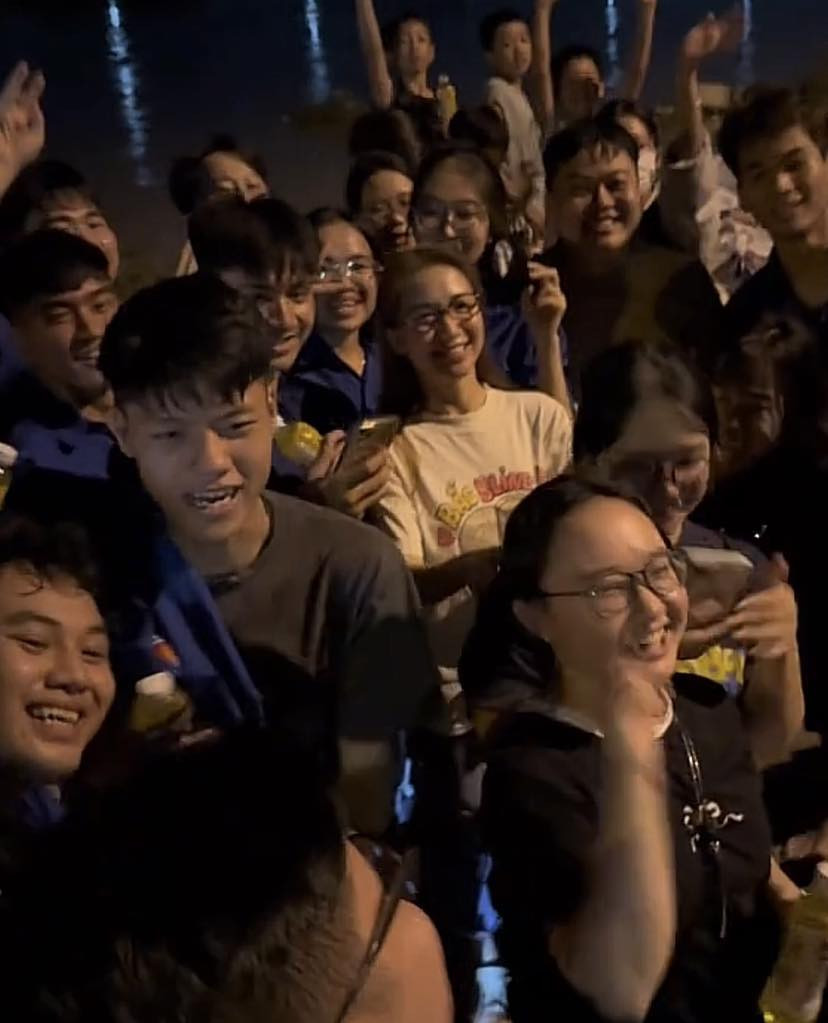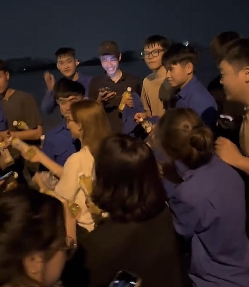Trong video, người đẹp diện trang phục đơn giản gồm áo phông, quần jeans xắn gấu, thân thiện hỏi những người xung quanh đã được ăn gì chưa. Cô cũng chuẩn bị sẵn nước uống và đưa cho từng bạn trẻ để “uống cho có sức”.