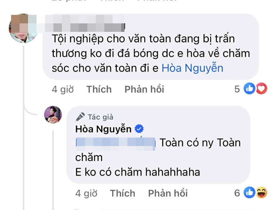Ngoài ra, khi được fan nhắc khéo: "Tội nghiệp cho Văn Toàn đang bị chấn thương không đi đá bóng được. Em Hoà về chăm sóc cho Văn Toàn đi em!". Giọng ca Bắc Bling tiết lộ chấn động: "Toàn có người yêu Toàn chăm. Em không có chăm nha".