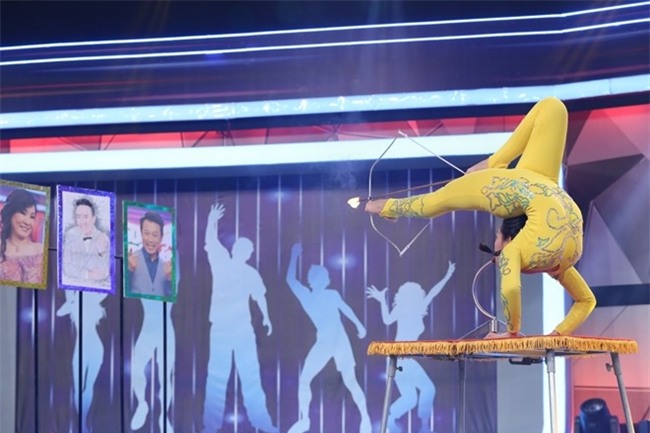 Nguyễn Xuân Trúc, diễn viên xiếc của đoàn Long An mới 16 tuổi nhưng đã có 6 năm kinh nghiệm trong nghề. Màn trình diễn của cô gái trẻ khiến các nghệ sĩ thán phục khi uốn lượn cơ thể, dốc ngược thân hình và dùng chân bắn mũi tên vào khung ảnh của Trấn Thành. |