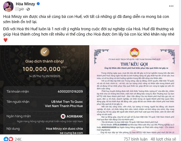 Mới nhất, Hòa Minzy chia sẻ trên trang cá nhân. Cô viết: "Hoà Minzy xin được chia sẻ cùng bà con Huế, với tất cả những gì đã đang diễn ra mong bà con sớm bình ổn trở lại.