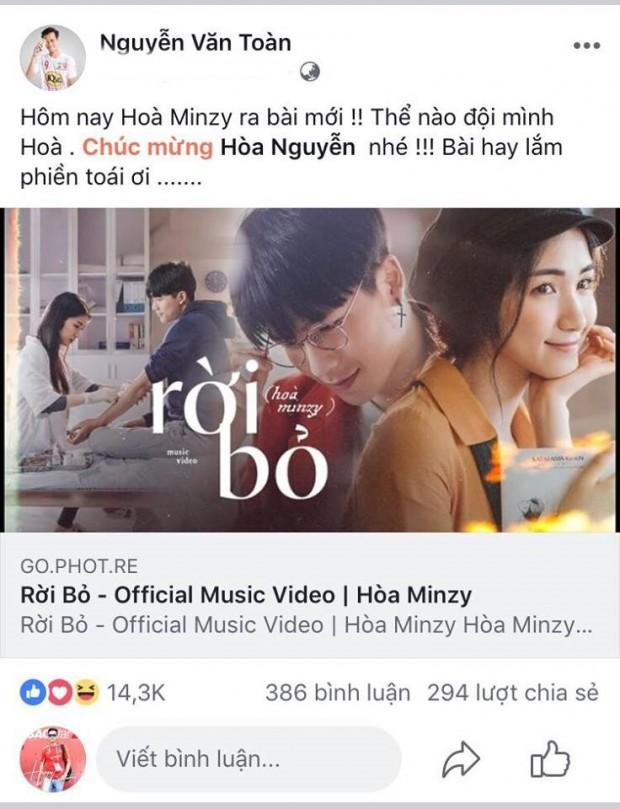 Tuy nhiên, bạn thân của Công Phượng là một câu chuyện khác. Hôm cô ca sĩ Bắc Ninh ra bài hát mới đã được Văn Toàn gửi đến một lời động viên cực kỳ dễ thương trên Facebook rằng: “Hôm nay Hòa Minzy ra bài hát mới! Thể nào đội mình hòa. Chúc mừng Hòa Nguyễn nhé (nick name trên Facebook của Hòa Minzy). Bài hát hay lắm phiền toái ơi…”.