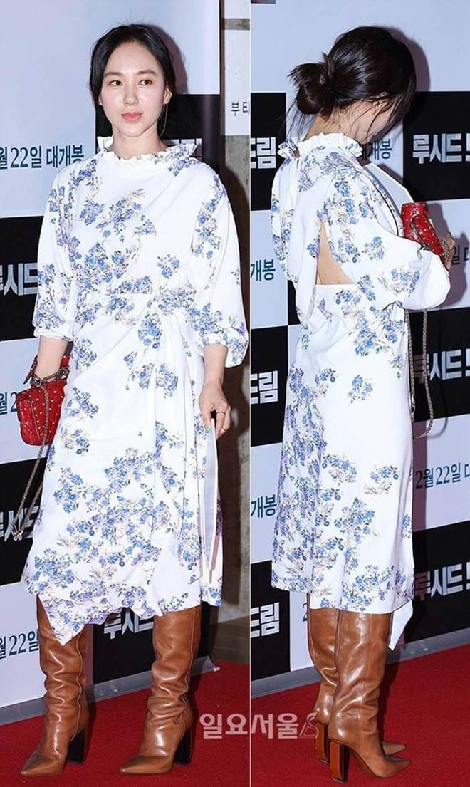 Họa tiết hoa kết hợp với chất ren cần rất khéo léo và hài hòa về màu sắc nếu không muốn bị chê như bà thím giống Kim Min Hee. Cô cũng bị thấp hơn thực tế khi chọn giày cổ cao kết đôi với váy dài.