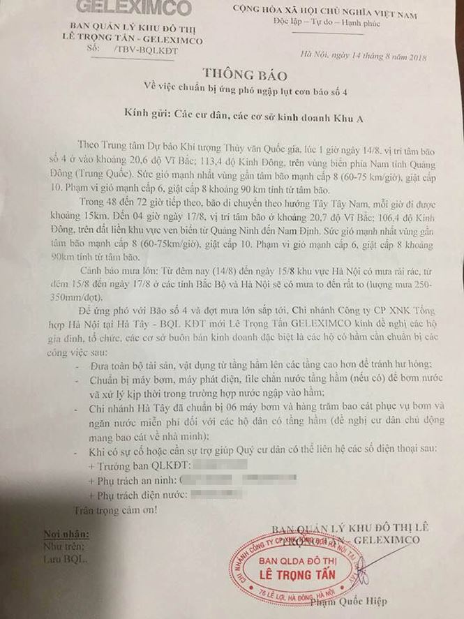 Trong thông báo "hỏa tốc" gửi cư dân, Ban quản lý KĐT mới Lê Trọng Tấn – Geleximco, yêu cầu các hộ dân tại đây đưa toàn bộ tài sản, vật dụng từ tầng hầm lên các tầng cao để tránh hư hỏng. Đồng thời, đề nghị cư dân chuẩn bị máy bơm, máy phát điện, file chắn nước tầng hầm (nếu có) để bơm nước và xử lý kịp thời trong trường hợp nước ngập vào hầm...