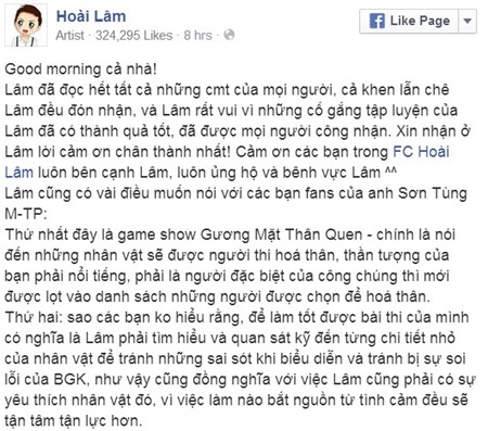 Hoài Lâm nói thêm: "Cho dù các bạn có ác cảm đi nữa nhưng trong thâm tâm các bạn phải thừa nhận một điều là Lâm đã làm tốt bài thi của mình chứ? Đó chính là sự nỗ lực của Lâm để thêm một lần nữa công nhận cái tài của Sơn Tùng. Lâm nghĩ, anh Sơn Tùng sẽ thấy vui khi nhìn thấy Lâm hoá thân thành anh ấy trên sân khấu Gương mặt thân quen".