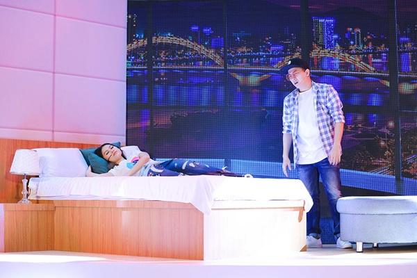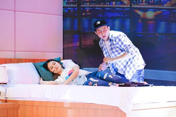 Khi câu chuyện đang gây tò mò cho nhiều người, màn hình chiếu bất ngờ được xoay ngược lại và cặp đôi Minh Khôi - Diệu Hiền đã lộ diện ngay trên sân khấu với bối cảnh như đang ở trong một khách sạn.