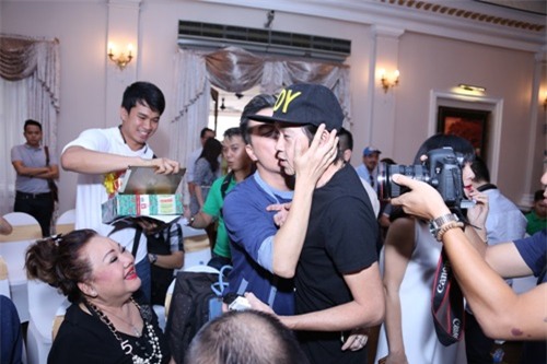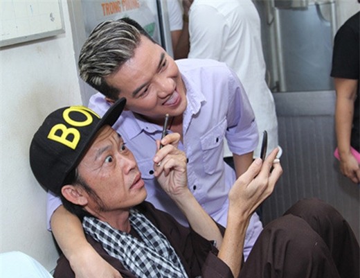 Hoài Lâm là con nuôi của Hoài Linh nên anh thường dành tặng người cha đáng kính những cái hôn tình cảm. Đáp lại, Hoài Linh giả bộ kiểu hài hước trước ống kính phóng viên.