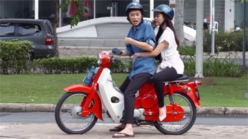 Lúc đóng cảnh làm xe ôm, được bạn diễn nữ trẻ đẹp ngồi ôm phía sau, anh lại phải đóng cảnh hốt hoảng không chịu.