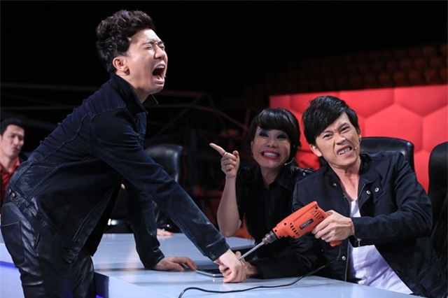 Hoài Linh lấy máy khoan của nhóm người bí ẩn diễn cảnh khoan tay Trấn Thành, MC cũng nhanh chóng nhập cuộc bằng gương mặt đau đớn đầy hài hước. |
