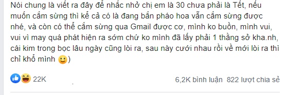 Nói chung muốn chia sẻ để nhắc nhở chị em là 30 chưa phải là Tết. Nếu muốn 'cắm sừng' thì kể cả có là đang bắn pháo hoa vẫn cắm sừng được nhé, còn có thể 'cắm sừng' qua Gmail.