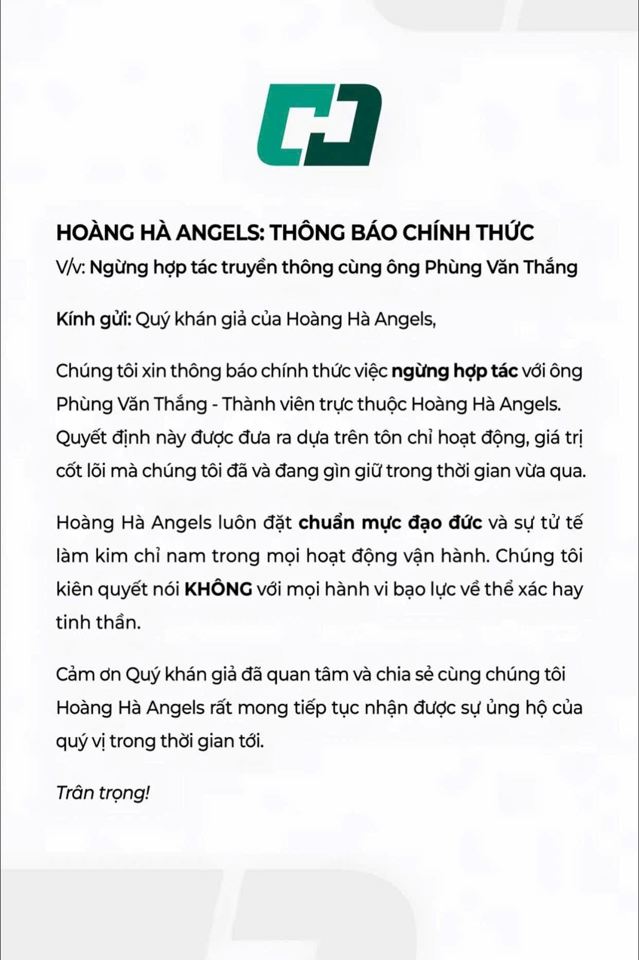 Cùng lúc này, phía Hoàng Hà Mobile - đơn vị mà Thắng làm việc cũng đã ra thông báo chính thức, đăng tải trên kênh Hoàng Hà Angels (kênh sáng tạo nội dung giải trí thuộc thương hiệu Hoàng Hà Mobile). Theo đó, đơn vị này cho biết chấm dứt ngừng hợp tác với Phùng Văn Thắng (tên thật của Thắng Không Kịp).