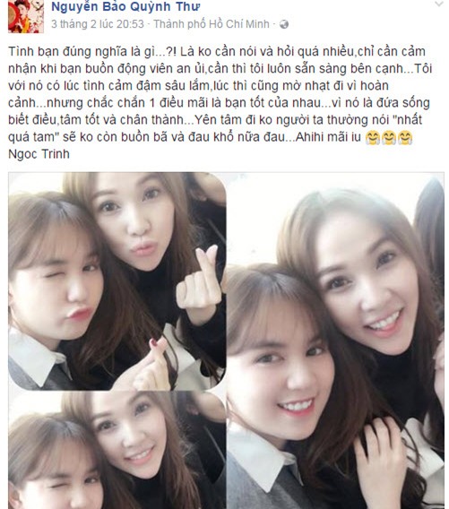 Trong khi Hoàng Kiều vui vẻ tổ chức đêm nhạc Tạ tình trong không gian lãng mạn và hoành tráng, Ngọc Trinh cũng bắt đầu vui trở lại khi liên tục khoe ảnh tươi cười bên ông bầu Vũ Khắc Tiệp, bạn thân Quỳnh Thư và doanh nhân Phượng Channel.