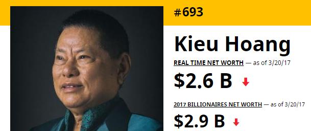 So với năm 2016, doanh nhân gốc Việt Hoàng Kiều đã giảm 240 bậc trên bảng xếp hạng người giàu nhất thế giới của Forbes.