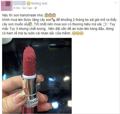 Dòng chia sẻ cùng hình ảnh thỏi son được chị V.T đăng lên trang cá nhân. |