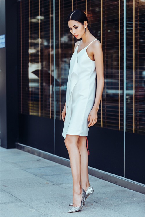 Đường bèo nhấn chính giữa chiếc váy khiến trang phục thêm nét nhấn nhá sang trọng.